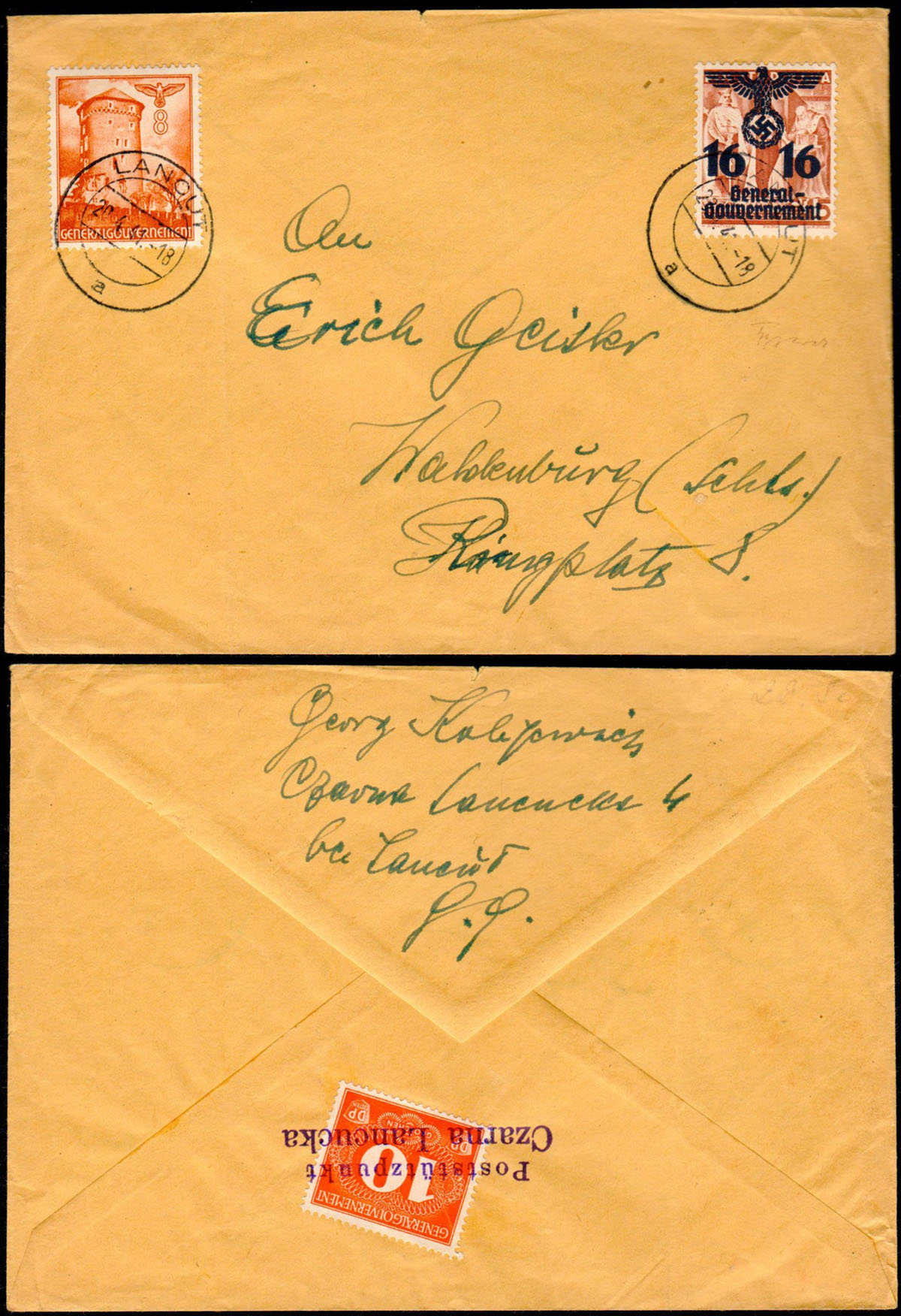 1941 znaczek doręczeniowy skasowany stemplem '''Poststützpunkt / Czarna Lancucka" na liście do Waldenburgu na Śląsku, znaczki opłaty skasowane urzędzie zwierzchnim w Łańcucie. | Fi.D1, 34, 41 |