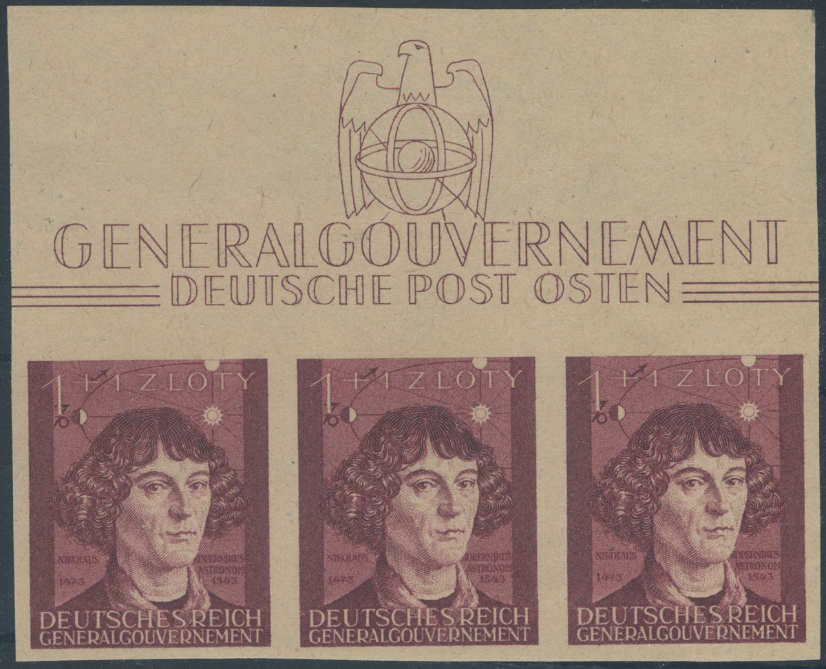 1943 400. rocznica śmierci Mikołaja Kopernika, pasek niegumowanych nieząbkowanych marginesowych prób na papierze żółtym bez nadruku, ładny stan, gwarancja Jungjohann. | Fi.104nz |