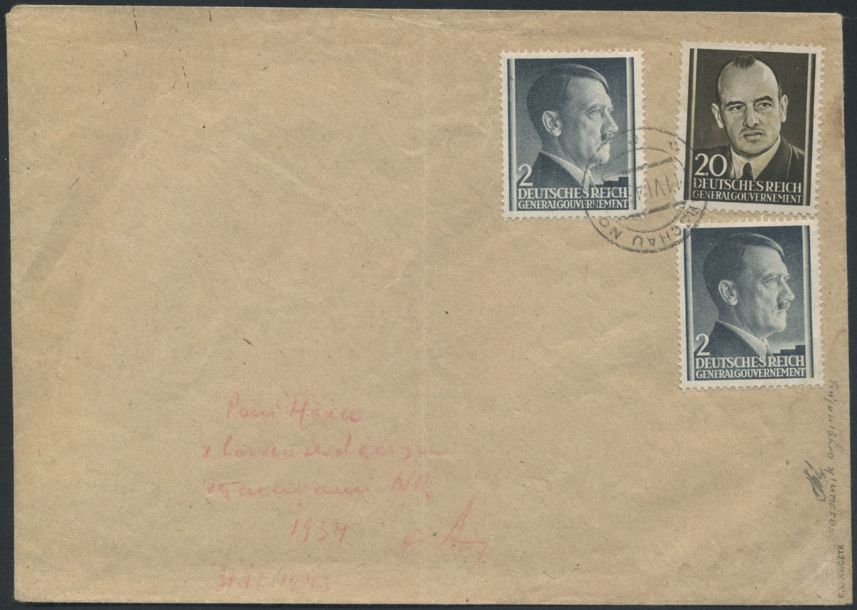1943 znaczek dywersyjny z podobizna gubernatora Hansa Franka wydrukowany w Wielkiej Brytanii, przypominający znaczek serii obiegowej z podobizną A. Hitlera, rozsyłany w czerwcu 1943 do instytucji i dygnitarzy Rzeszy sugerując bezprawne wydanie GG, znaczek z dwoma znaczkami GG uzupełniającymi do opłaty za zwykły list w wysokości 24 gr., znaczki unieważnione kasownikiem "WARSCHAU " z datą 11.06.43, list zapewne bez obiegu z dopisanym adresem, niemniej dużą rzadkość, gwarancja Krawczyk. | Fi.AII |