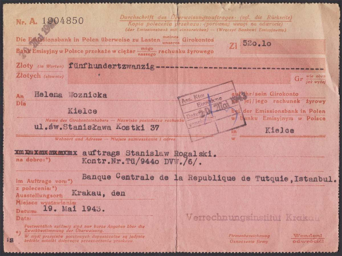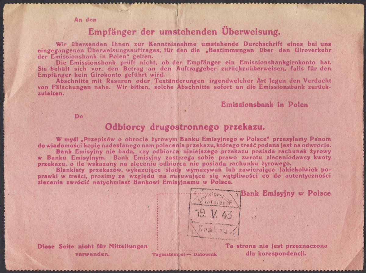 1943 Kopia polecenia przelewu Banku Emisyjnego (Durchschrift des Überweisungsauftrages) na kwotę 520,10 zł z Turcji do Kielc, na odwrocie kwadratowy datownik "Emmisionsbank in Polen Krakau" 19.V.43., na froncie stempelek bankowy z datą "20. Mai 1943" dostawioną osobnym datownikiem; niecodzienny dokument w dobrym stanie zachowania;