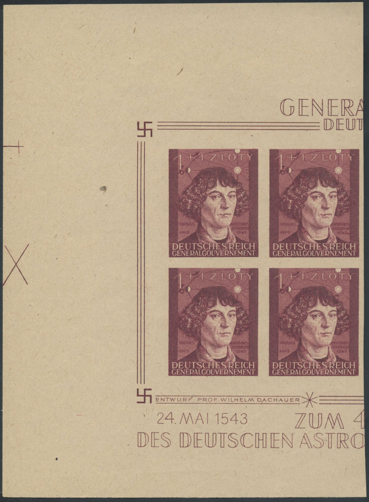 1943 400. rocznica śmierci Mikołaja Kopernika, nieząbkowany niegumowany czworoblok prób bez wydrukowanych dat z lewego fragmentu arkusika, gwarancja Jungjohann. | Fi.104nz |