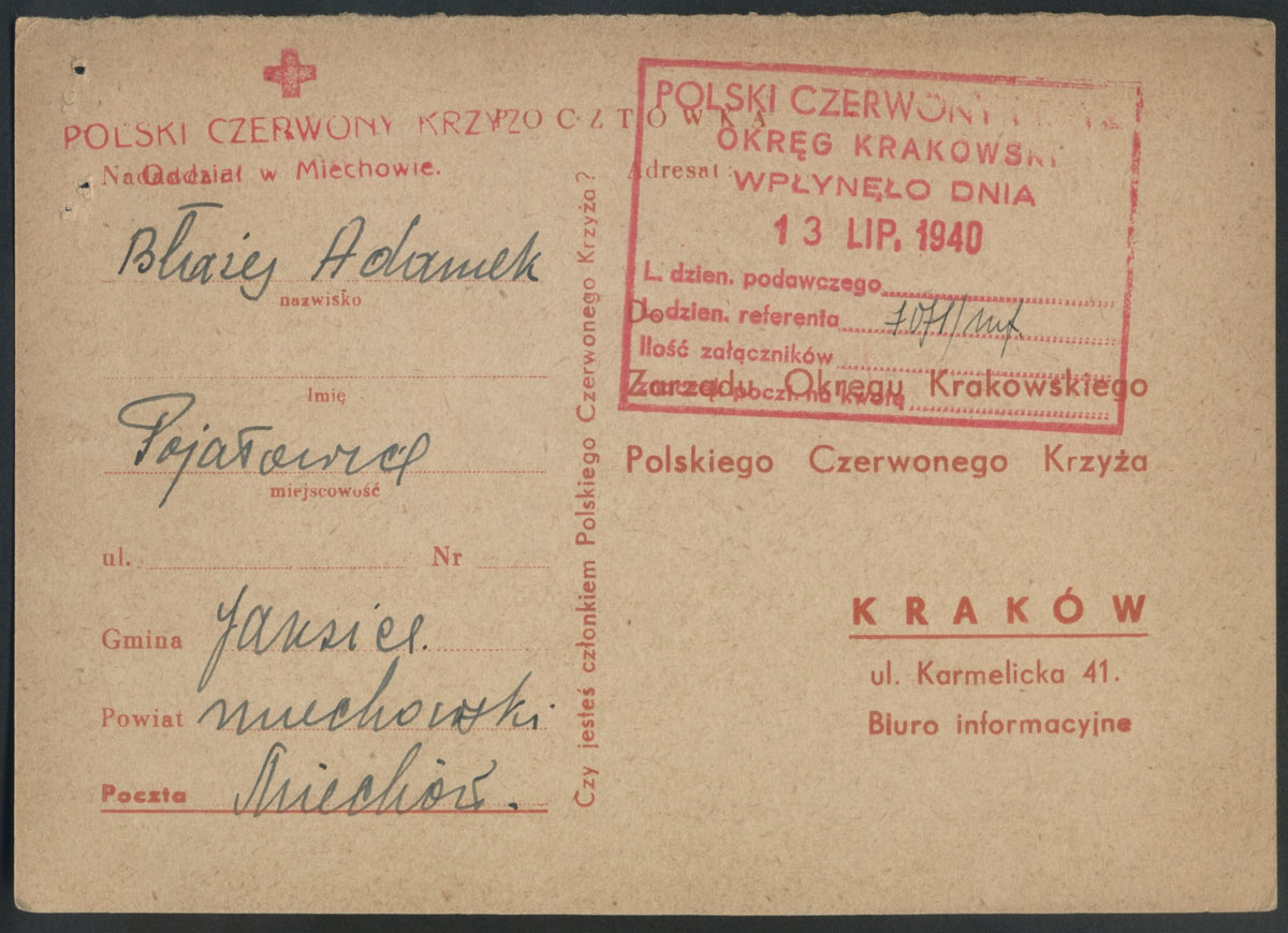 1940 formularz poszukiwawczy Polskiego Czerwonego Krzyża w Krakowie. | |
