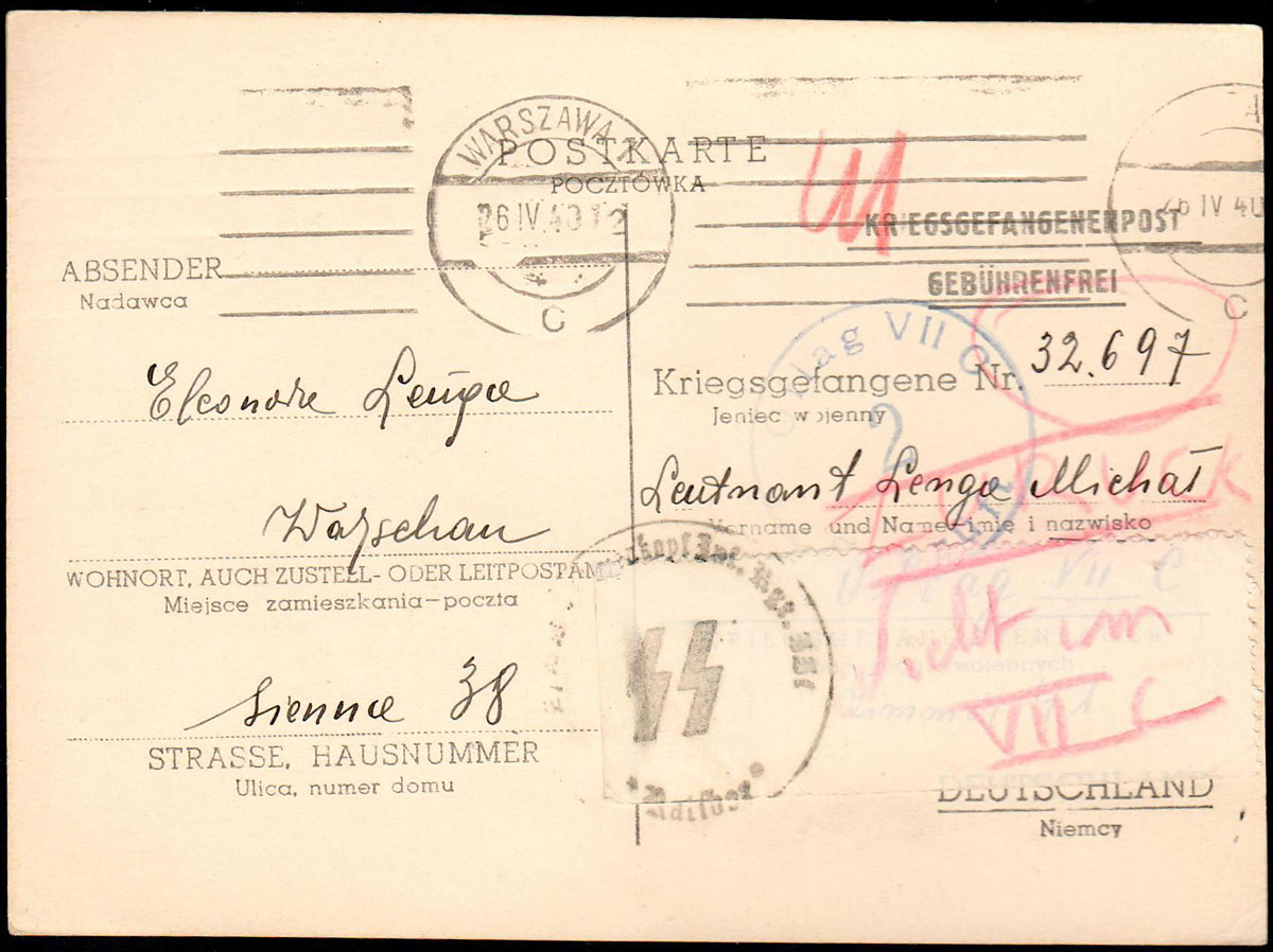 1940 kartka na specjalnym druku wysłana z Warszawy 26.04.40 do Oflagu VII C, stempel cenzury Obozu z numerem cenzora „2” oraz adnotacja odręczna wraz ze stemplem SS. | |