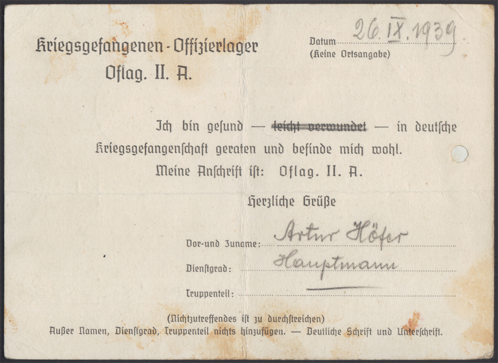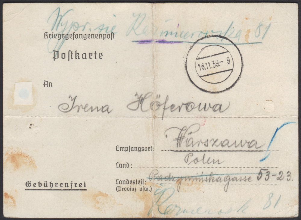 1939 Oflag IIA - pierwsza wiadomość z obozu jenieckiego - wczesny, przygotowany jeszcze przed wybuchem wojny formularz informacyjny, co niespotykane przeznaczony dla konkretnego obozu - wydrukowana nazwa Oflag. II. A., datowany 26.IX, ale wysłany dopiero 16.11 z obozu do Warszawy, na miejscu dosłany, niemy datownik nadawczy; w czasie gdy nadawca pisał tę kartkę walczył jeszcze Modlin (do 29.9), Warszawa skapitulowała dzień wcześniej (28.9), Hel bronił się do 2.10, a ostatnia, zwycięska dla Polaków bitwa pod Kockiem (2-6.10) jeszcze się nie rozpoczęła; walor z początkowego okresu funkcjonowania obozów jenieckich w słabym stanie zachowania. | |