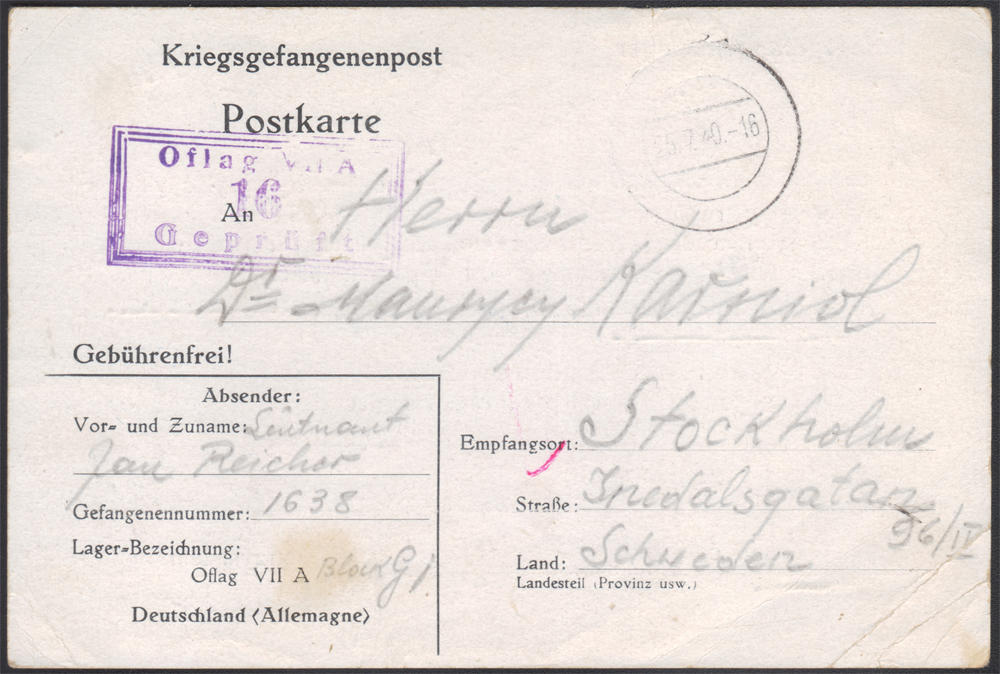 1940 PRZESYŁKA ZAGRANICZNA, Oflag VIIA Murnau – karta rzadki formularz informacyjny z wydrukowanym na odwrocie tekstem w języku polskim, datowana 20/7 wysłana 25.7 z obozu do Sztokholmu, niemy datownik nadawczy; fioletowy stempelek cenzury obozowej nr.16; walor w bardzo dobrym stanie zachowania (prawy narożnik złamany); rzadko spotykany kierunek wysyłki korespondencji jenieckiej.