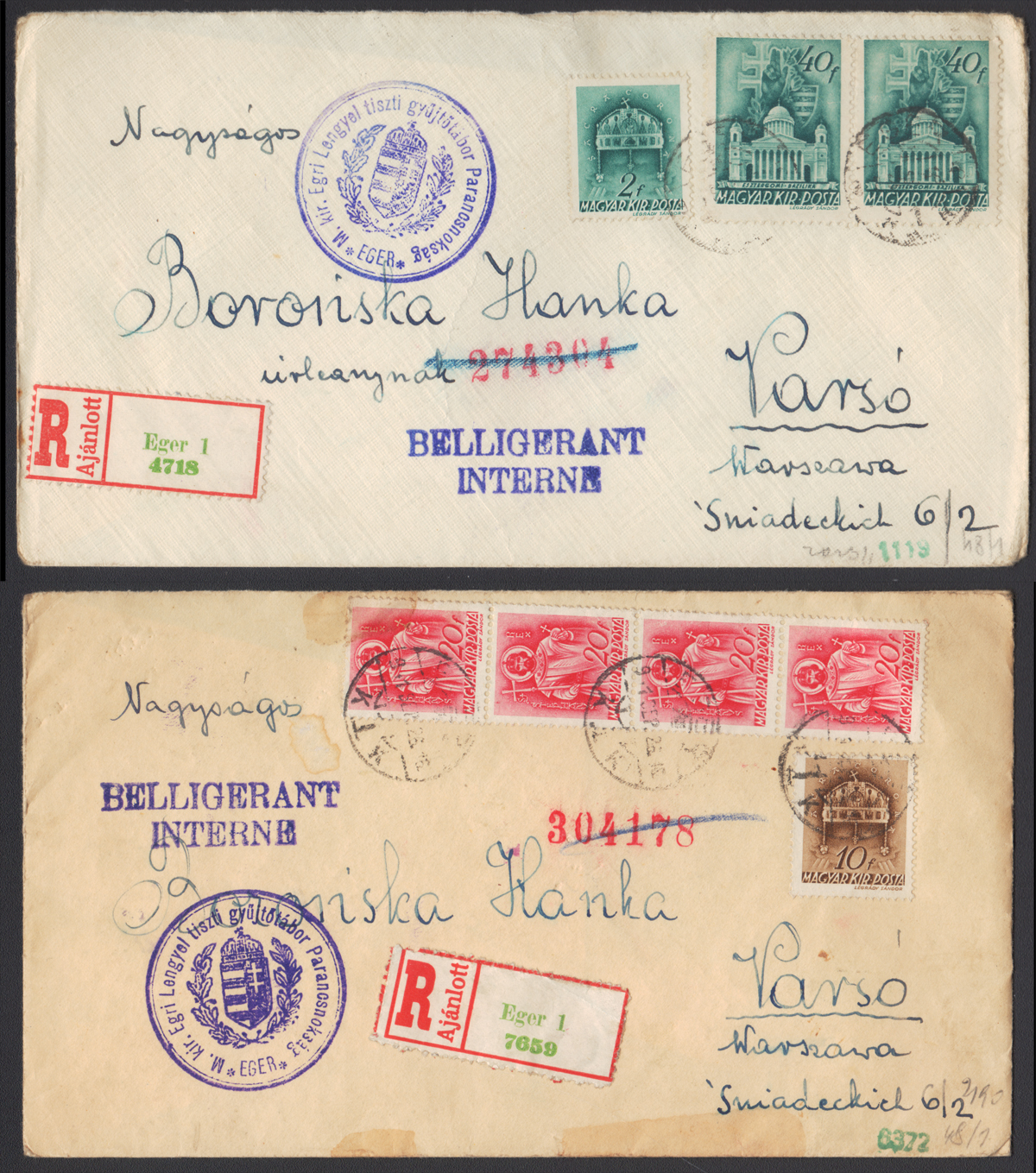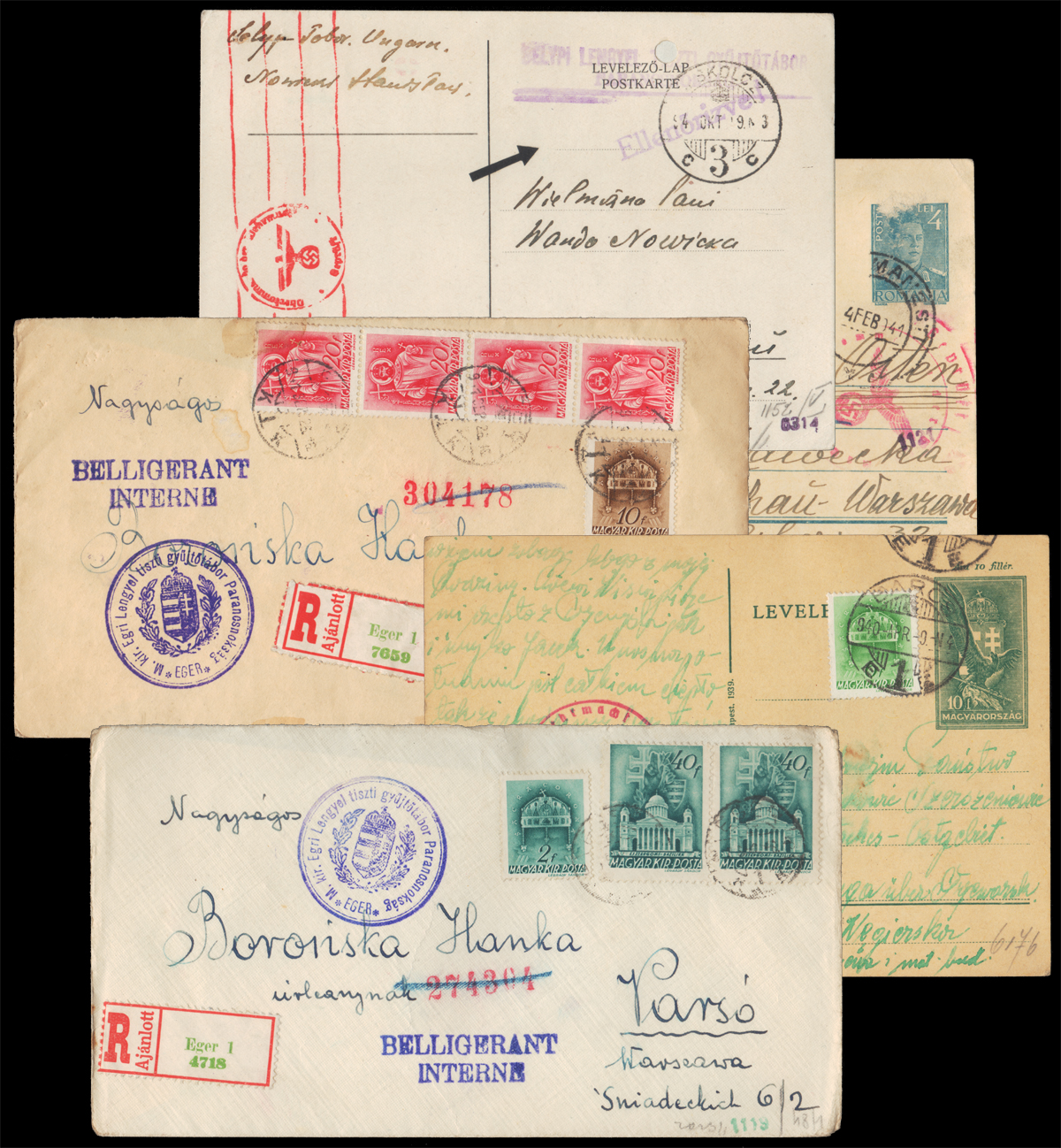 1940-41 Internowanie na Węgrzech i w w Rumunii, zestaw 5 całości (2 koperty + 3 karty) wysłanych z obozów dla internowanych Polaków: Barcs, Calimanesti, Eger, Selyp, bardzo dobry/słaby stan zachowania. | |