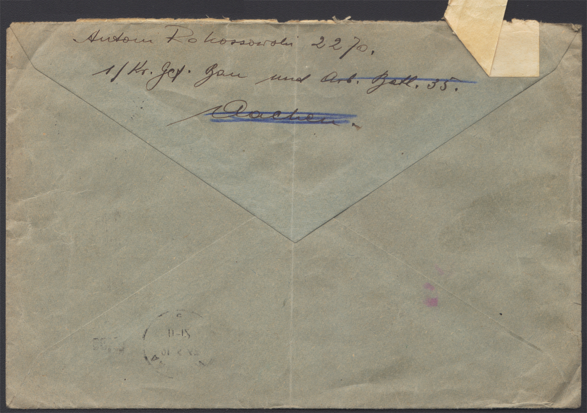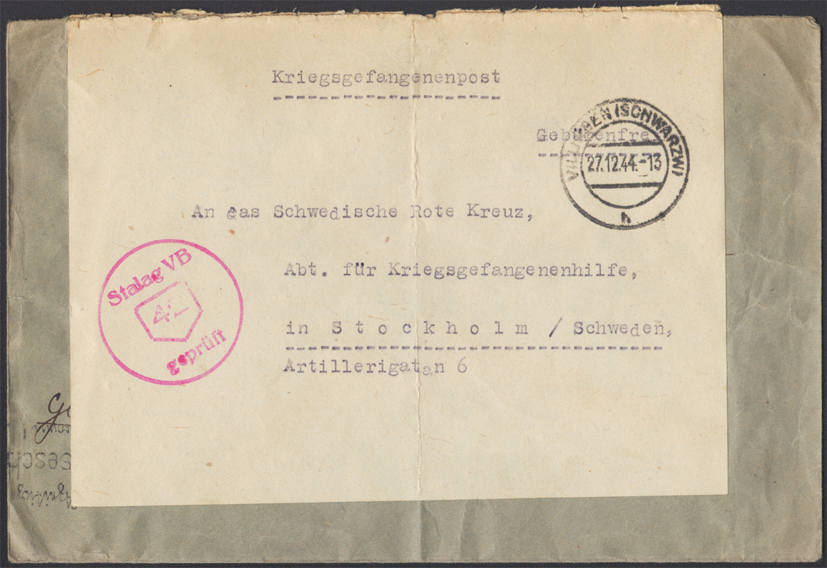 1943-44 BAB 1 - Stalag VB - Szwecja - list wysłany przez jeńca o nazwisku Anton Rokossowski z jenieckiego batalionu budowlano-roboczego BAB 1 z Akwizgranu (Aachen) do Męża Zaufania jeńców polskich Stalagu VB, na odwrocie widoczna lustrzana odbitka nadawczego datownika mechanicznego AACHEN 21 6 43, była to przesyłka nieregulaminowa, bowiem korespondencja z jeńcami dozwolona była wyłącznie na specjalnych formularzach, inne przesyłki dopuszczano tylko wyjątkowo; kopertę użyto ponownie, po naklejeniu na nią karty zakrywającej stary adres, z obozu wysyłając ją do Szwedzkiego Czerwonego Krzyża, datownik nadawczy z 27.12.1944 z WILLINGEN (SCHWARZW); stempelek cenzora obozowego "Stalag VB 42 geprüft"; walor o niespotykanym obiegu pocztowym w bardzo dobrym stanie zachowania. | |