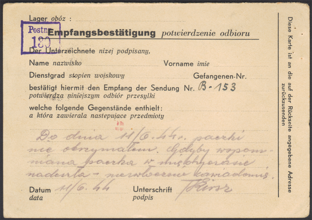 1944 Komitet Szwajcarski Pomocy Polskim Jeńcom Wojennym w Bernie, Stalag IVG - druk potwierdzenia otrzymania paczki - formularz z napisami niemieckimi i polskimi wysłany 14.6 przez jeńca z obozu do Schweizerisches Hilfswerk für Polnische Kriegsgefangene w Bernie, obozowy (niemy) datownik nadawczy, stempelek cenzora obozowego nr.18, berneński datownik odbiorczy z 23.VI, oraz stempelek ramkowy "Postnr.130"; rzadki dokument w dobrym stanie zachowania. | |
