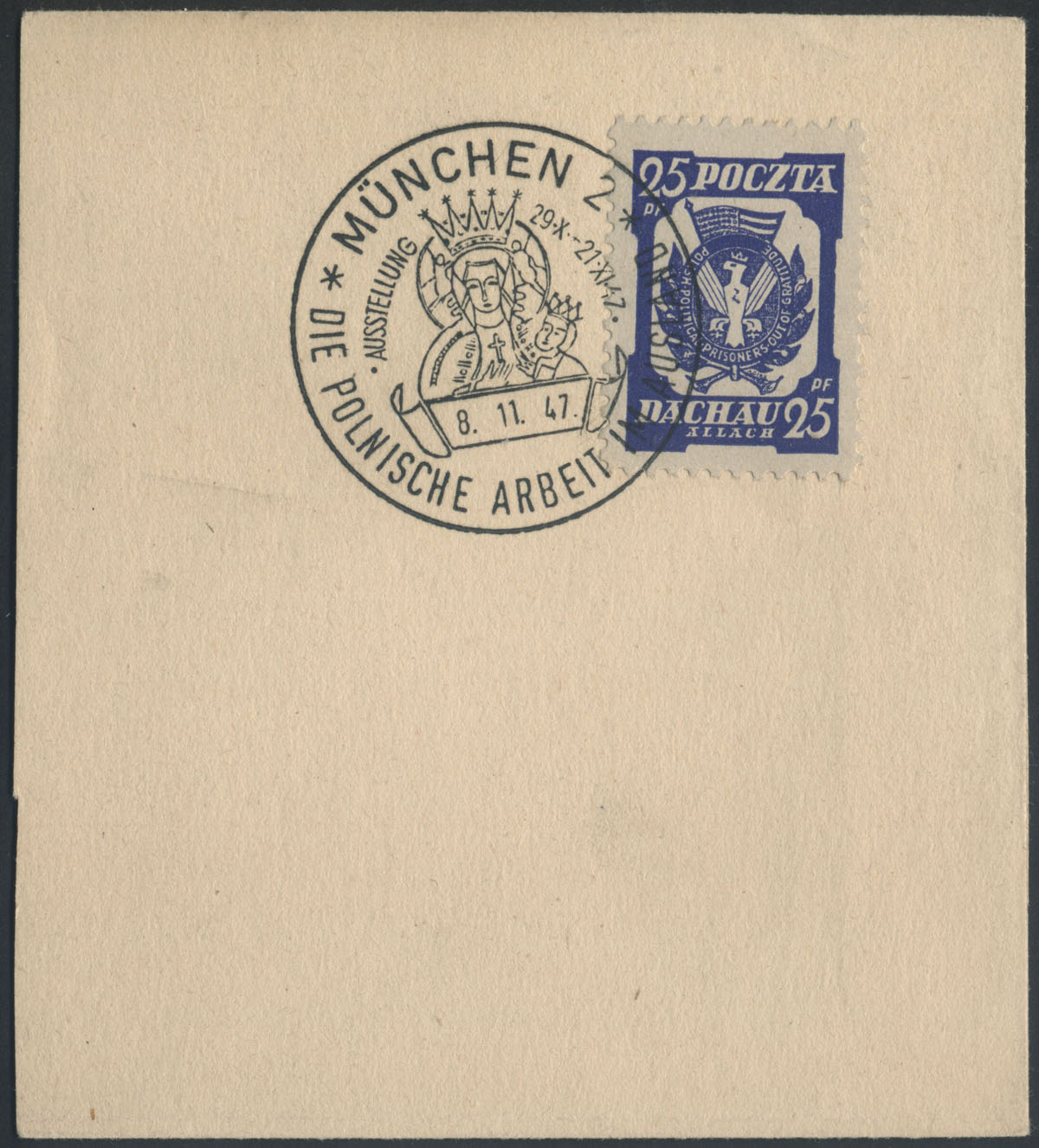 1947 PRACA POLSKA NA OBCZYŹNIE - wystawa w Monachium, znaczek skasowany stemplem okolicznościowy poczty niemieckiej w Monachium "POLNISCHE ARBEIT IM AUSLAND AUSSTELLUNG" z wizerunkiem Matki Boskiej Częstochowskiej. | |