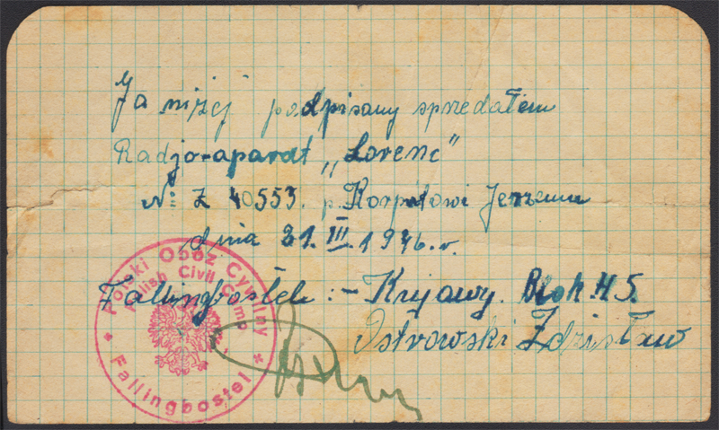 1946 Fallingbostel, poświadczenie transakcji sprzedaży odbiornika radiowego z dnia 31.III z okrągłą pieczęcią z orłem "Polski Obóz Cywilny Polish Civil Camp Fallingbostel", niecodzienny dokument, słabszy stan zachowania.