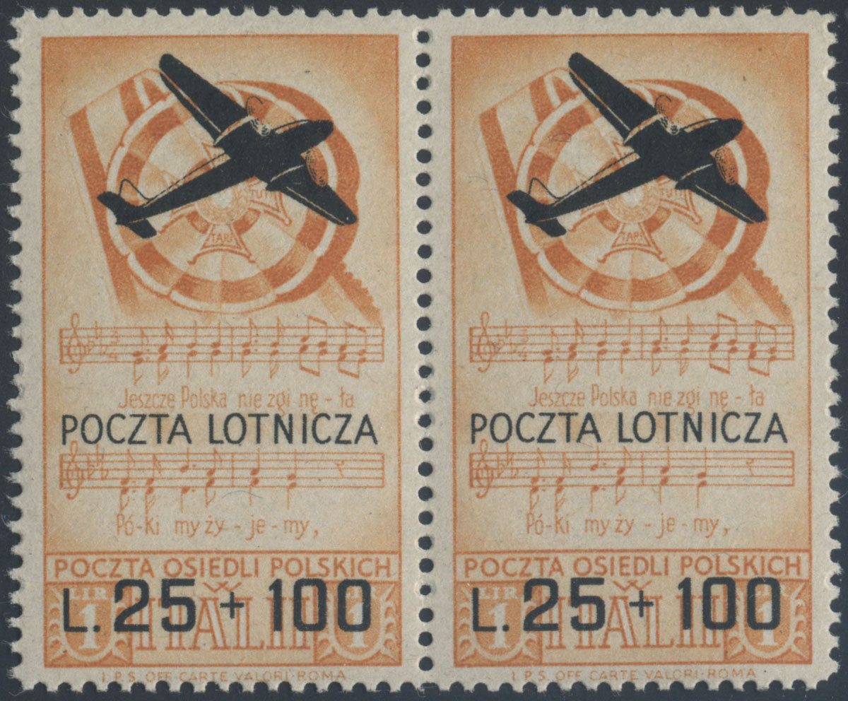 1946 Poczta osiedli polskich we Włoszech, wydanie lotnicze, próby nadruku " Poczta lotnicza - +L.25" wykonane typograficznie na znaczkach I wydania - ostatecznie wybrano druk techniką rotograwiury. | Fi.10 P |