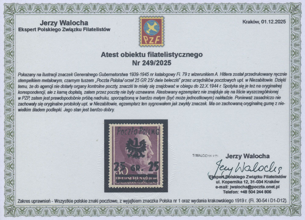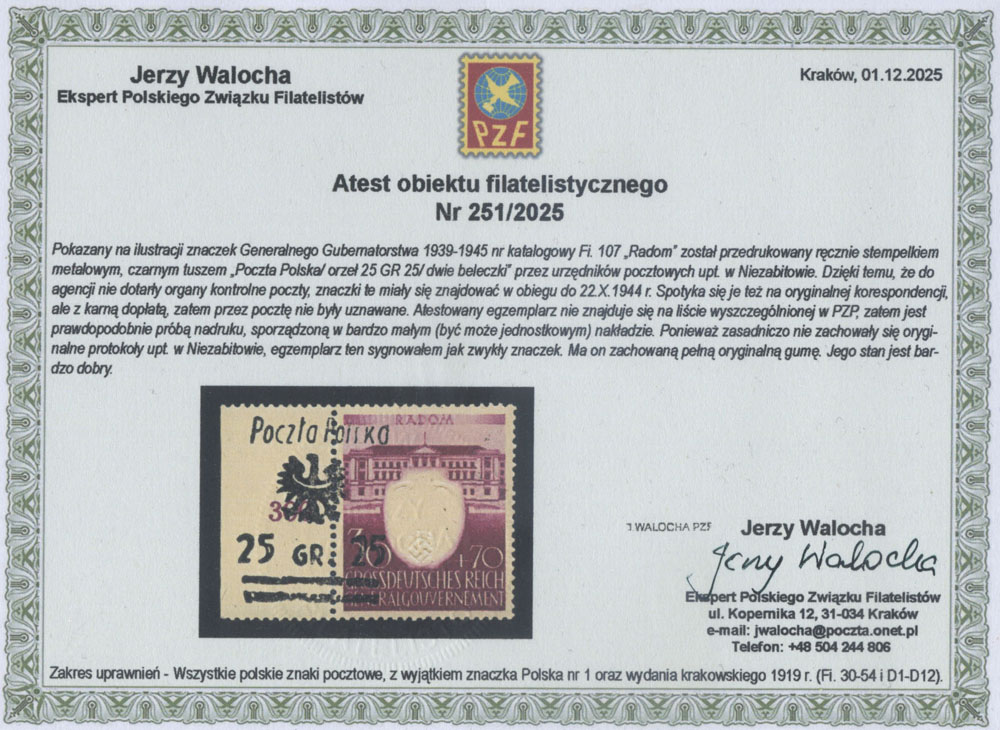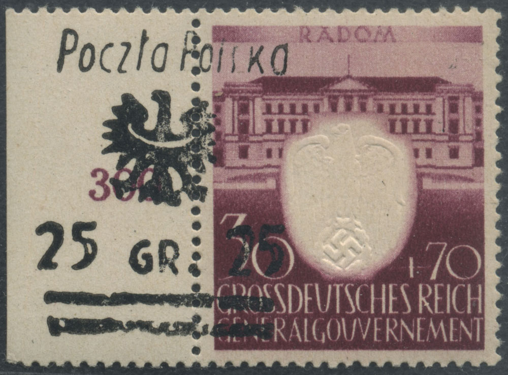 1944 Niezabitów, znaczek z nadrukiem nowego nominału 25 gr. zamiast 50 gr., prawdopodobnie próbna odbitka znaczków tego wydania, nakład nie ustalony prawdopodobnie pojedyncze sztuki, fotoatest Walocha. | Fi.9P |
