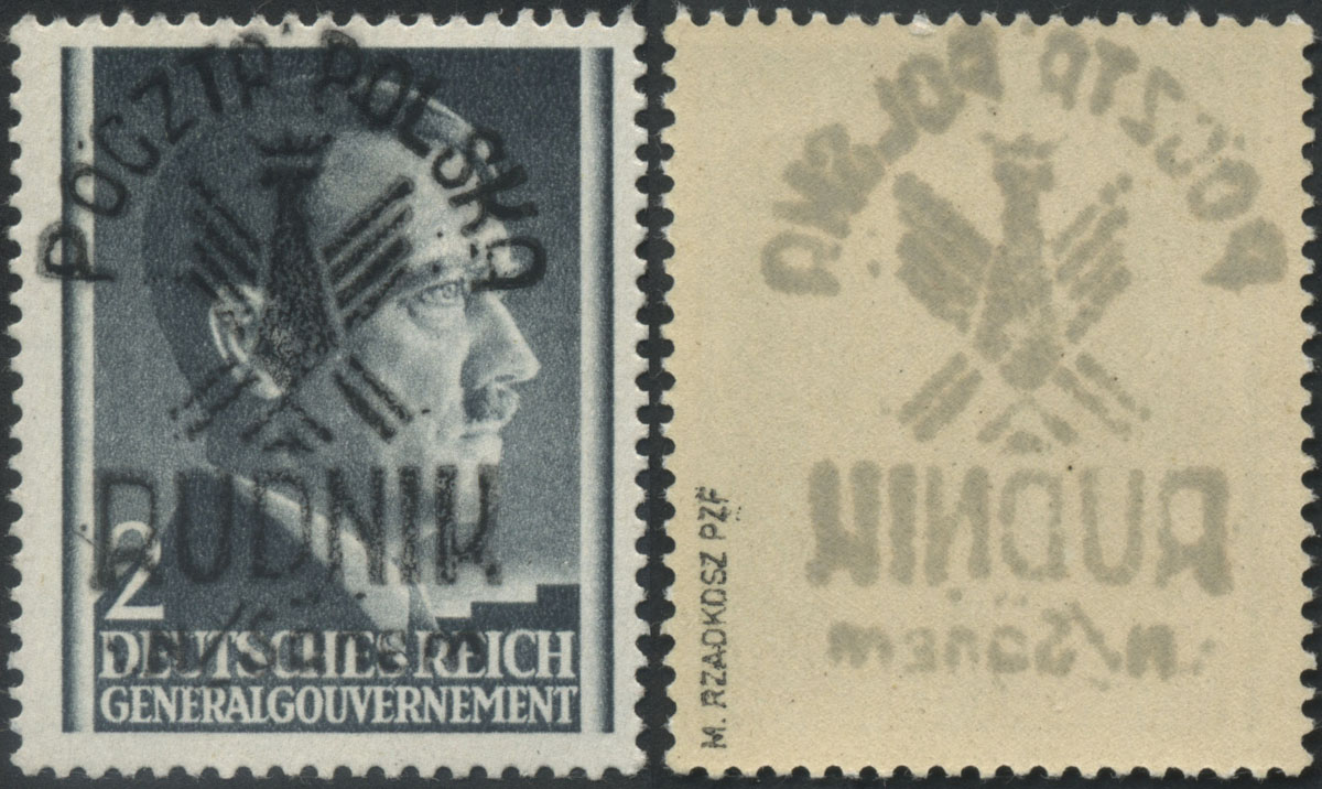 1944 Rudnik nad Sanem, znaczek z nadrukiem lokalnym typ III o nakładzie 135 sztuk, gwarancja Mikstein. | Fi.2III |