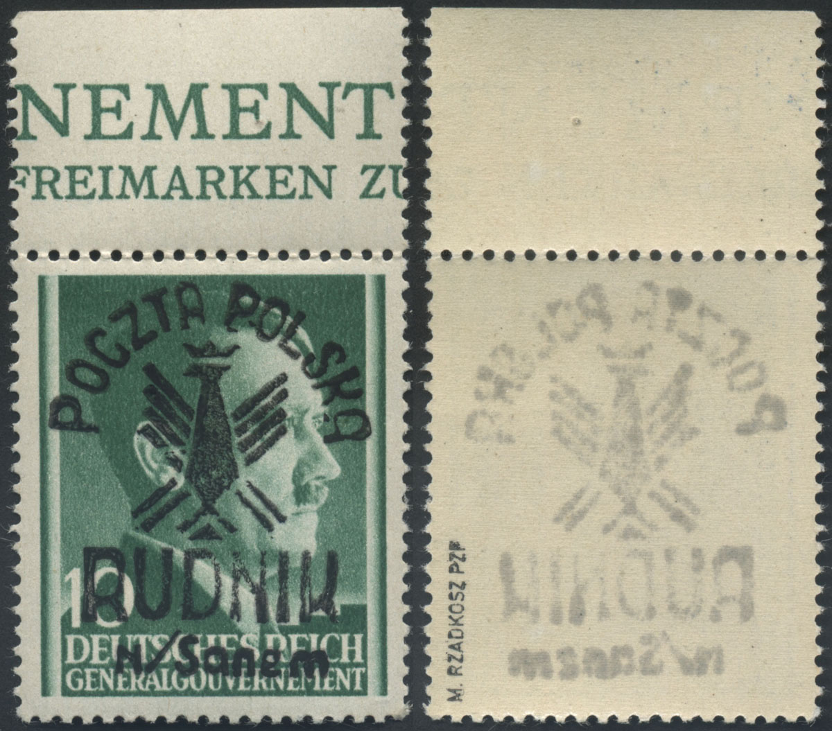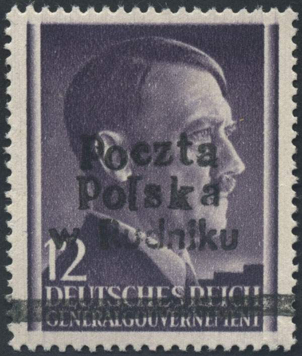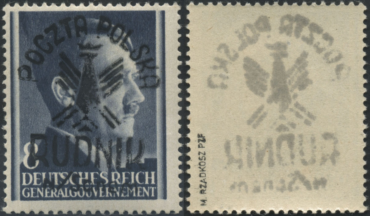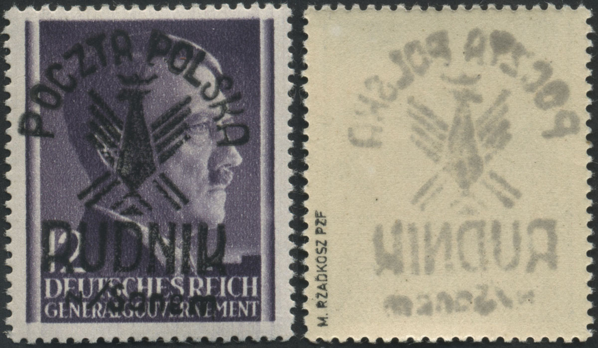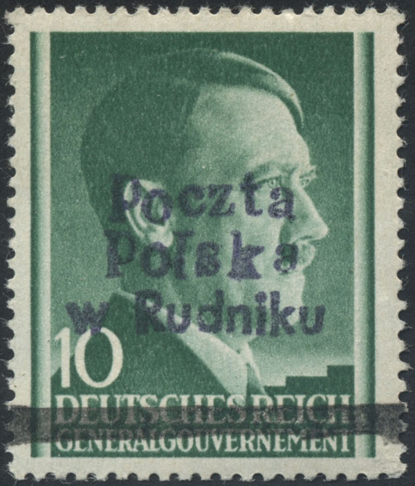 1944 Rudnik nad Sanem, znaczek z nadrukiem lokalnym typu I; napisy w barwie fioletowej i belka kasująca w barwie czarnej, może być to nadruk próbny, bardzo rzadkie, fotoatest Rzadkosz. | Fi.4I |