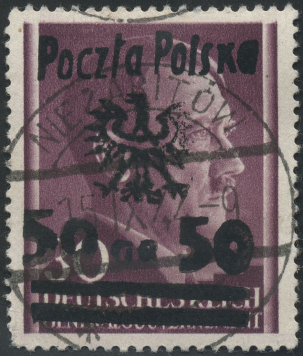 1944 Niezabitów - wydanie prowizoryczne, znaczek za 50/40 gr. z nadrukiem stempelkiem metalowym "Poczta Polska / Orzeł / 50 GR. 50 / belki", gwarancja Krawczyk. | Fi.11 |