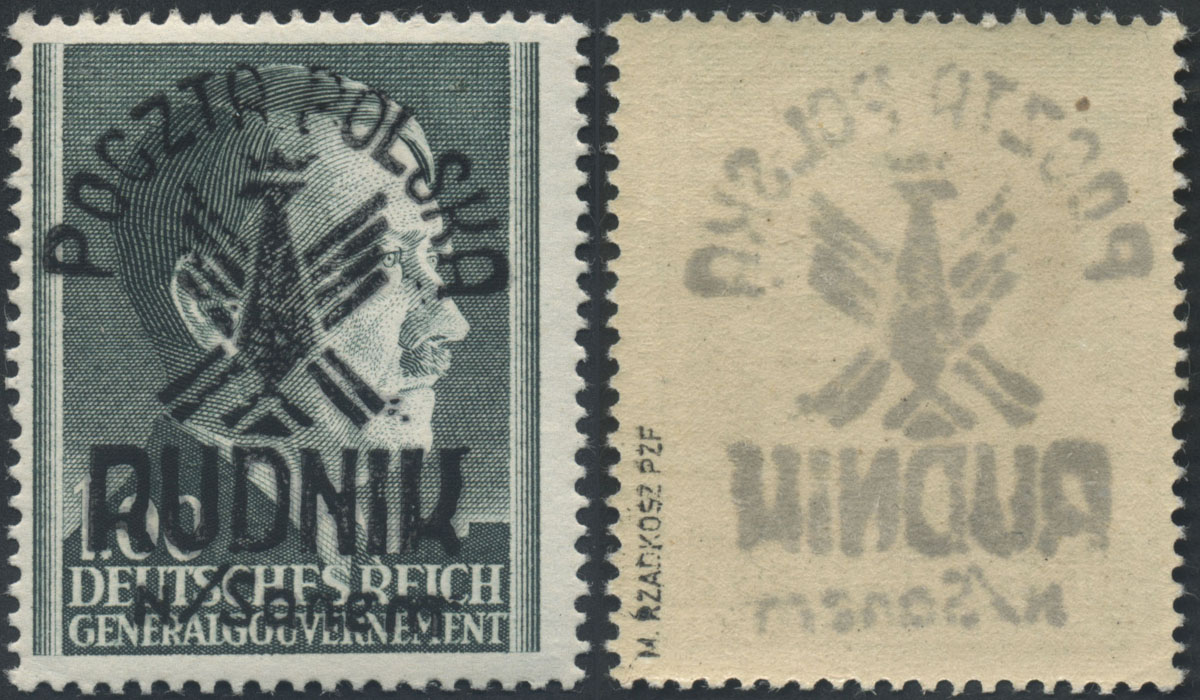 1944 Rudnik nad Sanem, znaczek z nadrukiem lokalnym typ I, znaczek nie katalogowany pochodzący od klientów poczty o nakładzie do kilku sztuk, podlepka, ogólnie dobry stan zachowania, gwarancja Mikstein, fotoatest. | |