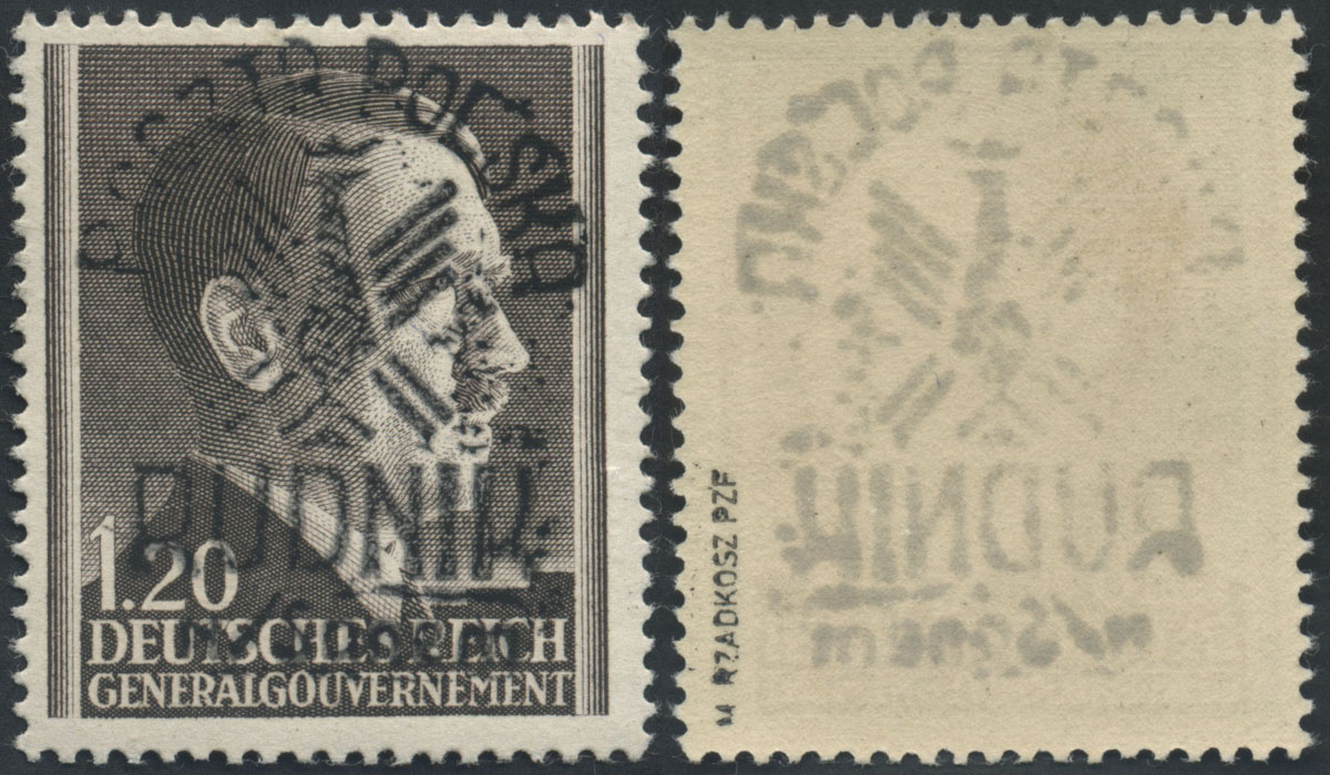 1944 Rudnik nad Sanem, znaczek z nadrukiem lokalnym typ IV, minimalny nieznany nakład - kilka sztuk, fotoatest. | Fi.21IV |