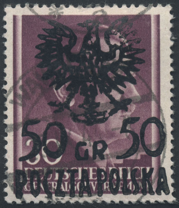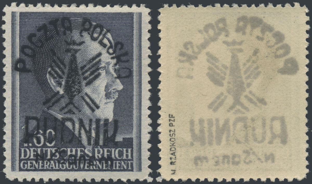 1944 Rudnik - wydanie prowizoryczne, unikalny znaczek za 48 gr. z niekompletnym nadrukiem stempelkiem gumowym typu I "Poczta / Polska / w Rudniku", przedrukowany w minimalnym ogólnym nakładzie 5 szt. - to unikat - jedyny znany egzemplarz bez belki pod napisem, dotąd opisano tylko niekompletny nadruk typu IV (bez napisu Polska); oferowany walor to jeden z najrzadszych znaczków Poczt Lokalnych 1944-45, piękny stan, gwarancja Gryżewski, Perzyński. | Fi.19I |