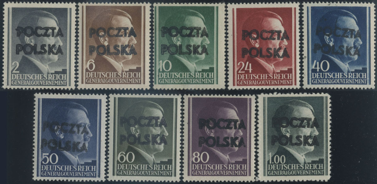 1945 Końskie, znaczki z nadrukiem lokalnym pochodzące z zapasów urzędu pocztowego w Końskich, gwarancja Rzadkosz. | Fi.1-9 |