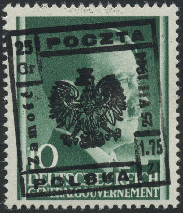 1944 Zamość - znaczek za 25 gr. + 1,75 zł./24 gr. wydania prowizorycznego - niebezpieczne fałszerstwo lokalnego nadruku ręcznym stempelkiem gumowym "Orzeł" i wokół "POCZTA / POLSKA / Zamość / 25 VII 1944" oraz nominał (nakład znaczka prawdziwego 16 szt.), ładny stan. | Fi.8 FFi |