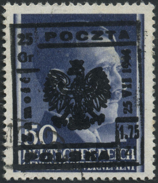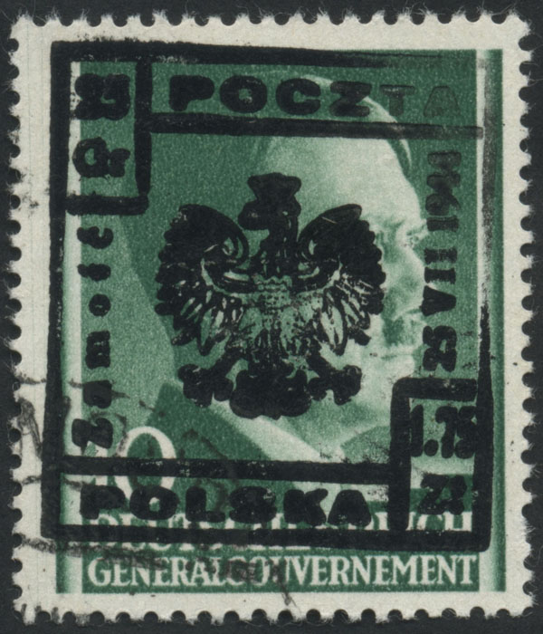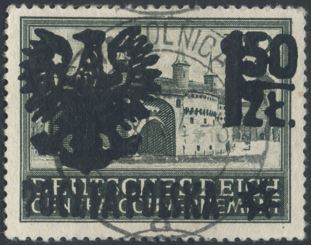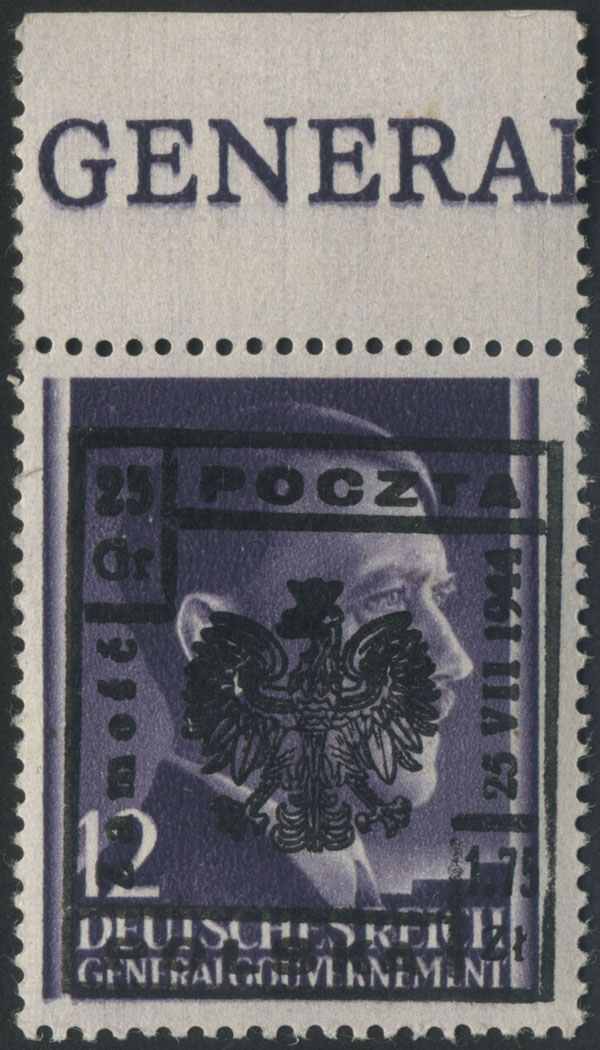 1944 Wąwolnica, znaczek z odwróconym nadrukiem lokalnym typu IX, nakład tych znaczków wyniósł 21, w tym ten jedyny dotychczas nie opisany egzemplarz z nadrukiem odwróconym, rarytas wydań lokalnych, fotoatest Rzadkosz. | Fi.26No |