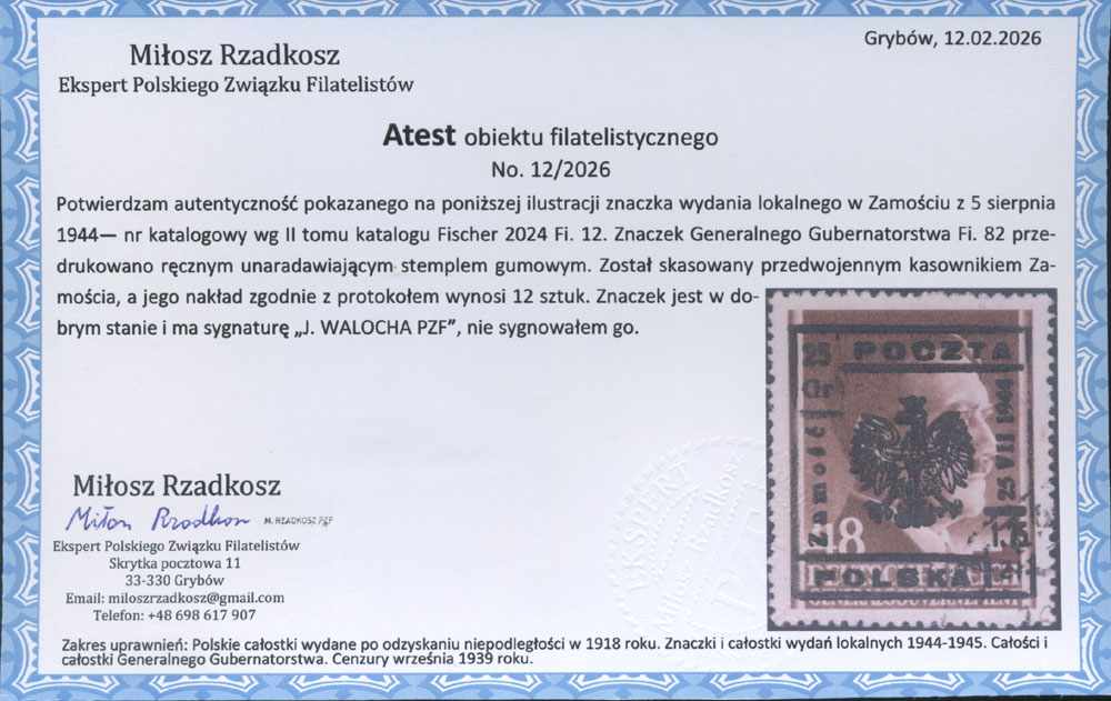 1944 Zamość, stemplowany znaczek z ręcznym nadrukiem lokalnym o nakładzie 12 sztuk !, fotoatest Rzadkosz. | Fi.12 |
