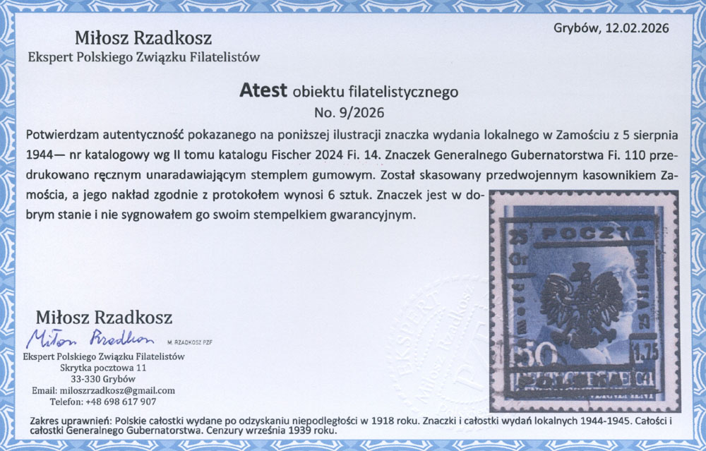1944 Zamość, stemplowany znaczek z ręcznym nadrukiem lokalnym o nakładzie 9 sztuk !, fotoatest Rzadkosz. | Fi.9 |