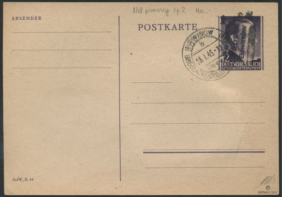 1945 Brwinów, całostka z pionowym nadrukiem lokalnym, gwarancja Krawczyk. | Fi.Cp2 |