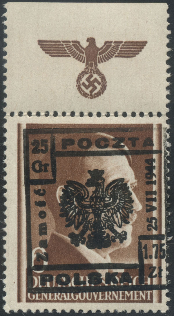 1944 Zamość, znaczek z nadrukiem lokalnym, nakład 22! sztuki, gwarancja Walocha, fotoatest Rzadkosz. | Fi.4 |