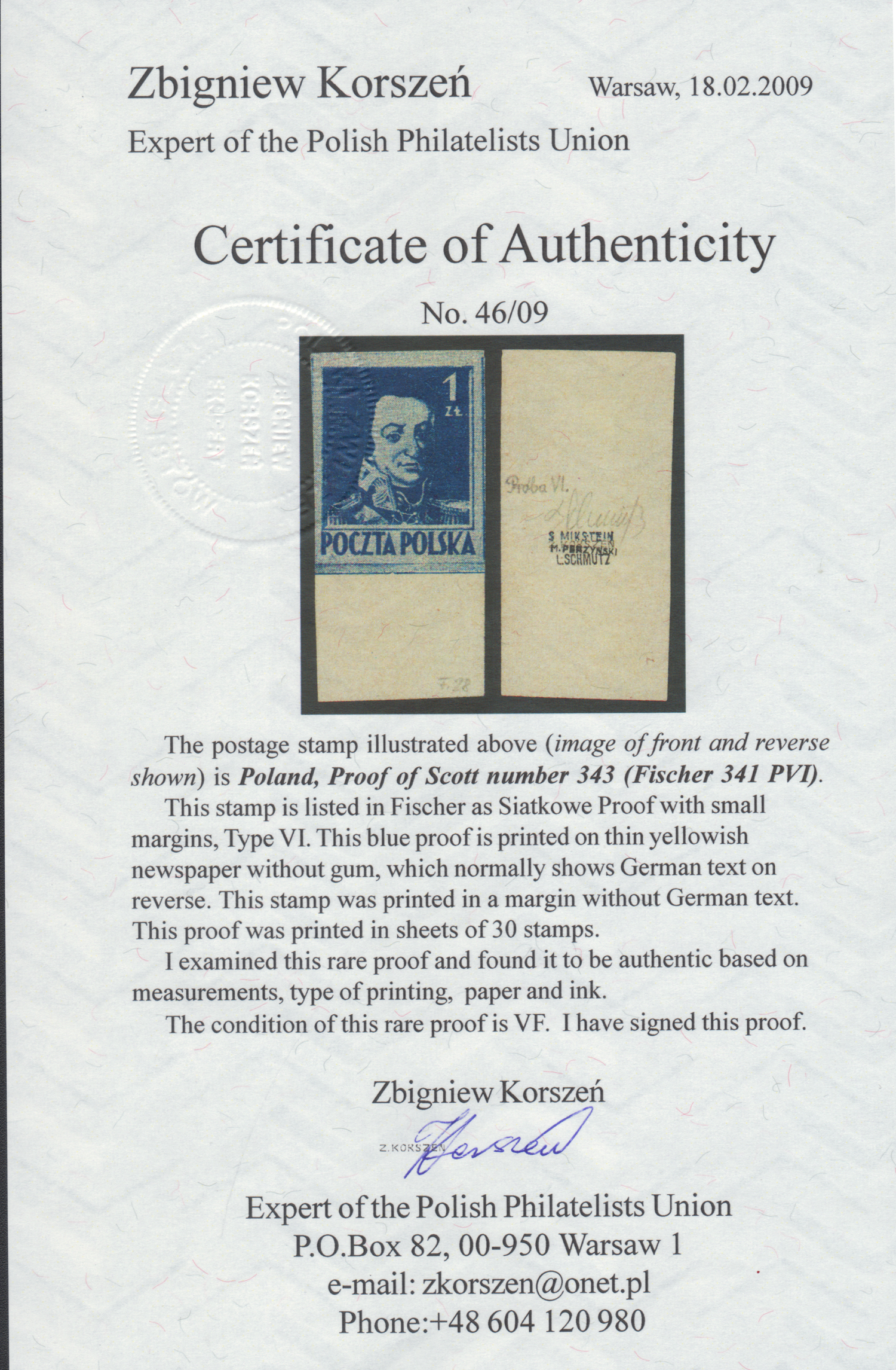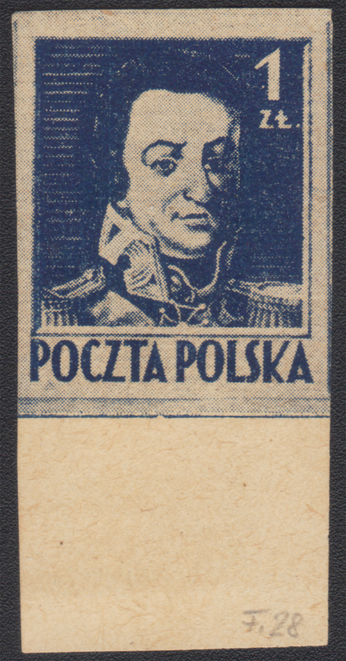 1944 Wodzowie - T.Kościuszko, próba arkuszowa znaczka za 50 gr. - poz.20, zagwarantowana i zaatestowana jako typ VI - z opiłowanymi marginesami, ma cechy obu rodzajów prób, nieostry nieco "rozmazany" rysunek charakterystyczny dla prób typu VI, biały cienki papier typowy dla prób typu V z nieopiłowanymi marginesami - spośród prób typu VI na takim papierze katalogowane są tylko próby znaczka za 25 gr. w kolorach jasnopomarańczowym, pomarańczowym i pomarańczowoczerwonym, gwarancja Mikstein, z oznaczeniem "340VI" Schmutz, gwarancja i fotoatest. | Fi.340 PV Mi.381 |
