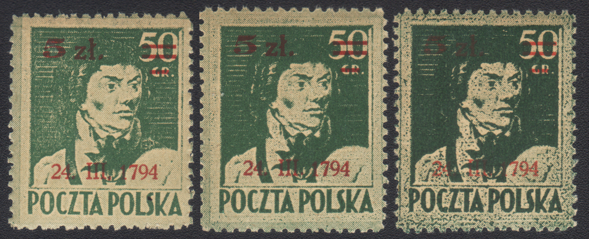 1945 151. rocznica powstania Kościuszkowskiego - wydanie przedrukowe, trzy znaczki za 5 zł./50 gr. w kolorach jasnozielonym, zielonym i ciemnozielonym. | Fi.361a, b, c Mi.398 |