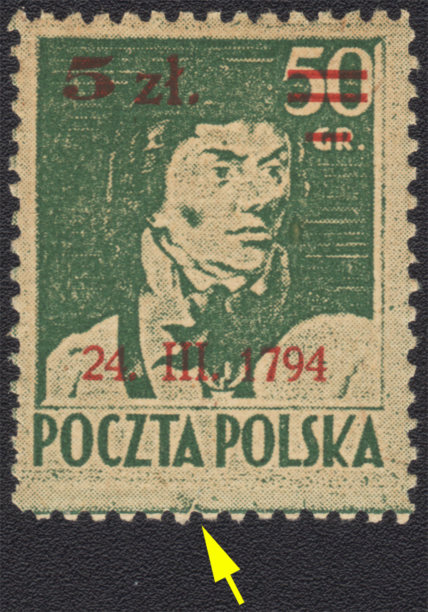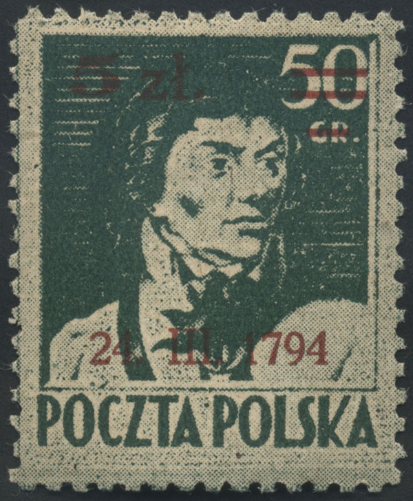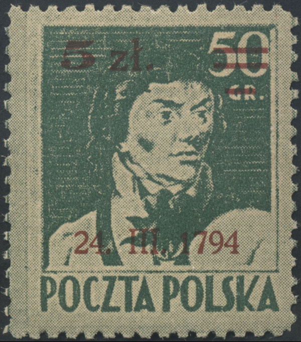 1945 151. rocznica Powstania Kościuszkowskiego, znaczek w barwie ciemnozielonej bez ząbkowania poziomego na dolnym marginesie, gwarancja Ryblewski. | Fi.361cMK1 Mi.398 |