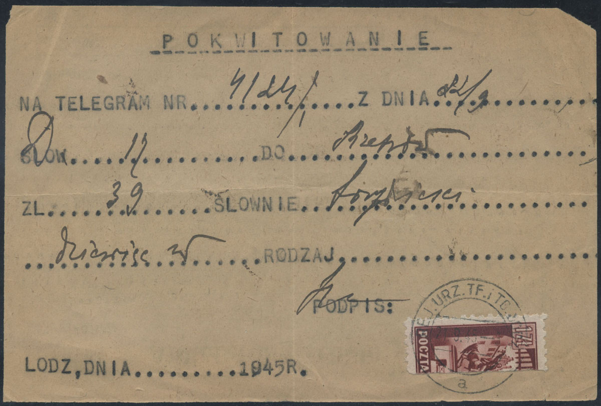 1945 prowizoryczne pokwitowanie telegraficzne z Łodzi opłacone połówką znaczka za 1 zł, stempel "REJ. URZ. TF.i TG. ŁÓDŹ", niespotykane użycie dzielonego znaczka z tego okresu. | Fi.363 |