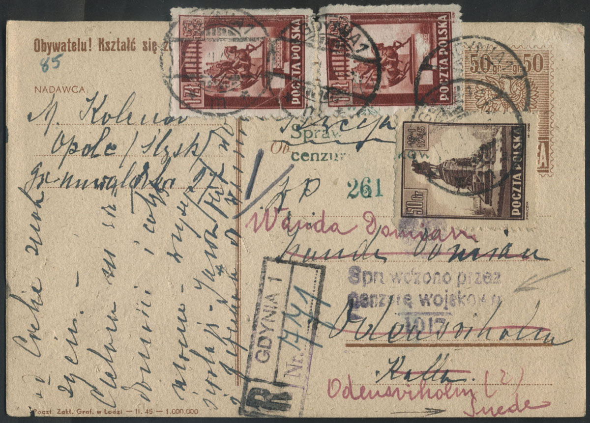 1945 kartka polecona z Gdyni do Szwecji, stemple cenzury wojskowej nr 261 i 1017. | Fi.362, 363, cp92 |