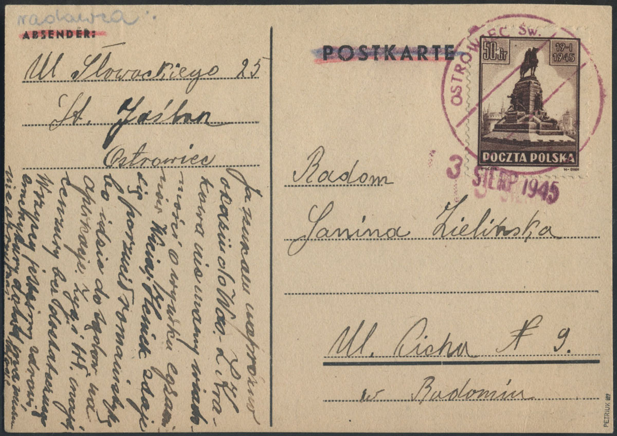 1945 kartka z Ostrowca Świętokrzyskiego do Radomia, prowizoryczny kasownik i datownik Ostrowca, gwarancja Petriuk. | Fi.362 |