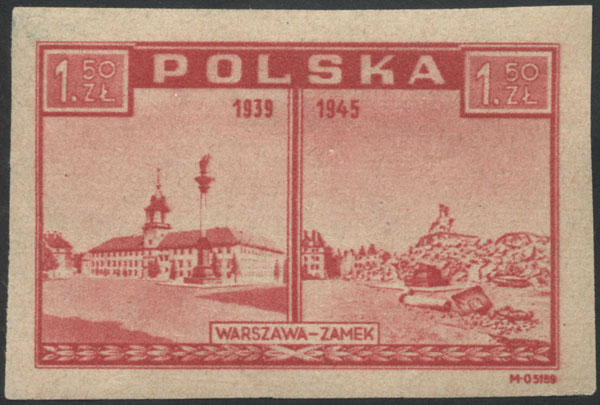 1945 Warszawa oskarża, znaczek w barwie karminowoczerwonej o nieostrym rysunku na papierze y4a, gwarancja i oznaczenie Walocha. | Fi.380b Mi.414 |