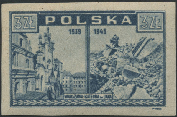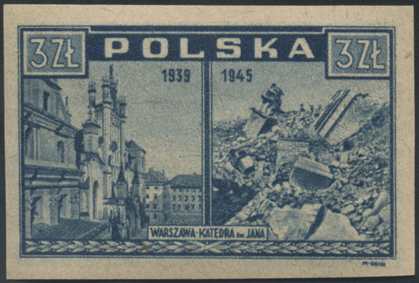 1945 Warszawa oskarża - katedra Św.Jana, znaczek za 3 zł. w rzadkim kolorze jasnoniebieskim i dodatkowo z błędem na poz.46 "belka w oknie", gwarancja. | Fi.381a B1 Mi.415 |