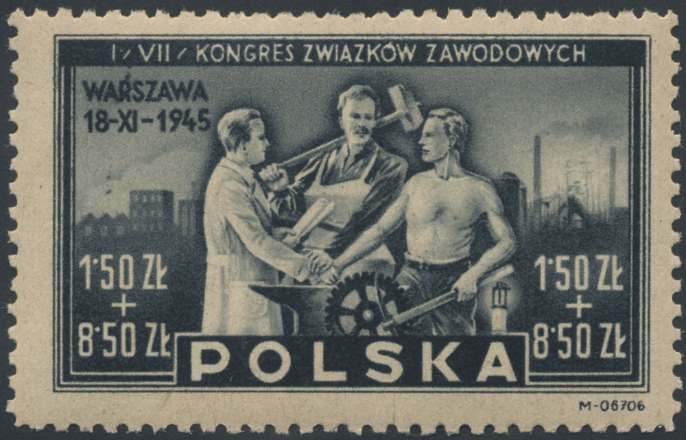 1945 Kongres Związków Zawodowych, oryginalnie okolicznościowo kasowany znaczek za 1,50+8,50 zł., znaczki z dopłatą rzadko były używane pocztowo, gwarancja Schmutz. | Fi.386 Mi.413 |