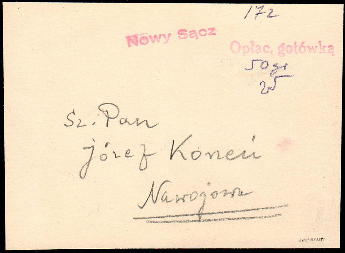 1945 kartka z Nowego Sącza do Nawojowej, stempel prowizoryczny „Nowy Sącz” i opłaty gotówkowej, gwarancja Piekut. | |