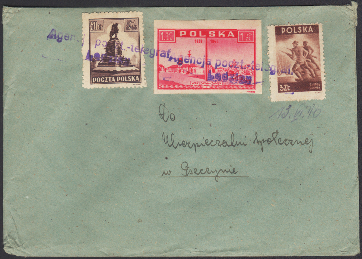 1946 LĘDZINY, list ofrankowany znaczkami różnych wydań wysłany z miejscowości Lędziny do Pszczyny, znaczki skasowane stemplem prowizorycznym - dwuwierszowym stemplem "Agencja poczt.-telegraf. Lędziny" z dopisaną ręcznie datą "13.VI.46" - L67b wg najnowszej monografii pp Z.Mąki J.Walochy i A.Kielbasy-Schoeni'ego Znaki nadawcze używane na korespondencji w placówkach pocztowych Rzeczypospolitej Polskiej od 1944 roku; bardzo dobry stan zachowania. | Fi.362I, 380, 405 Mi.393, 414, 438 |