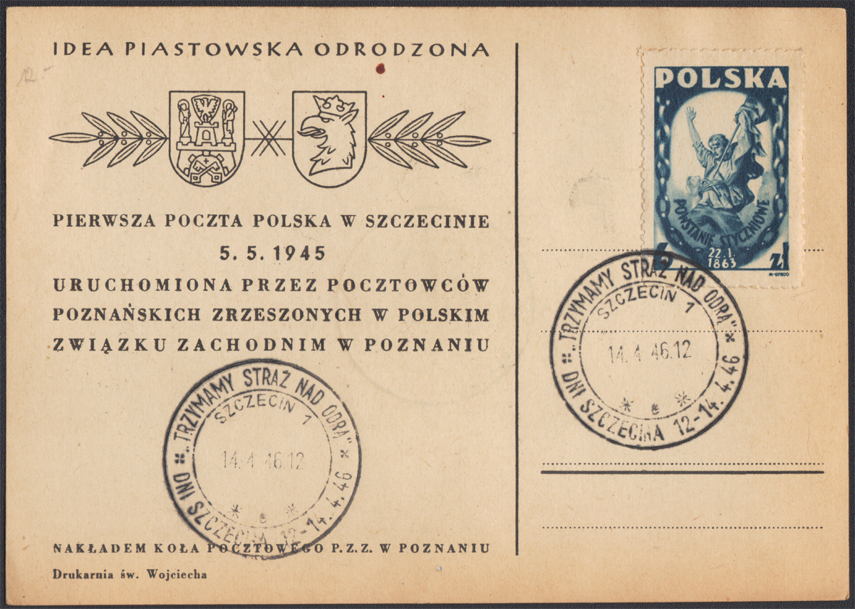 1946 83. rocznica Powstania Styczniowego, znaczek za 6 zł. na karcie pamiątkowej "IDEA PIASTOWSKA ODRODZONA" skasowany stemplem okolicznościowym "TRZYMAMY STRAŻ NAD ODRĄ * DNI SZCZECINA 12-14.4.46" rzadszym z wyróżnikiem "e" (Myślicki 46 007), kilka dni po wycofaniu z obiegu. | Fi.394 Mi.427 |