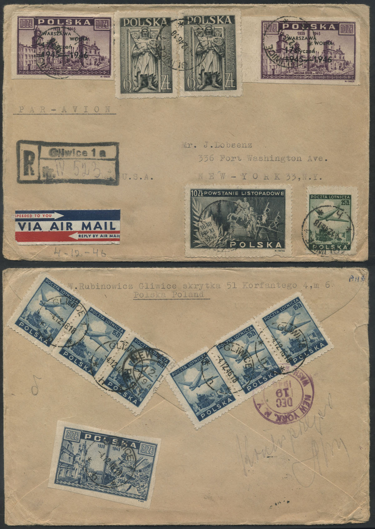 1946 polecony list lotniczy z Warszawy 12.VIII.46 do Szwajcarii, prowizoryczny kasownik i erka UP Warszawa 23, cenzura cywilna 3290. | Fi.383, 396 Mi.417, 429 |