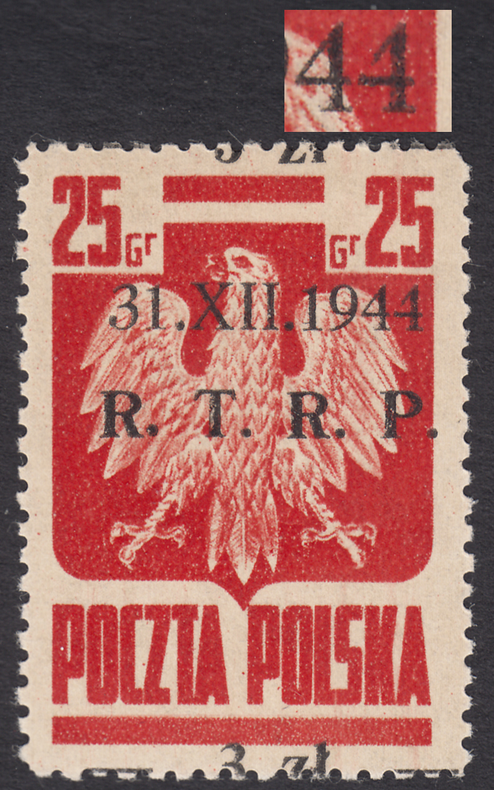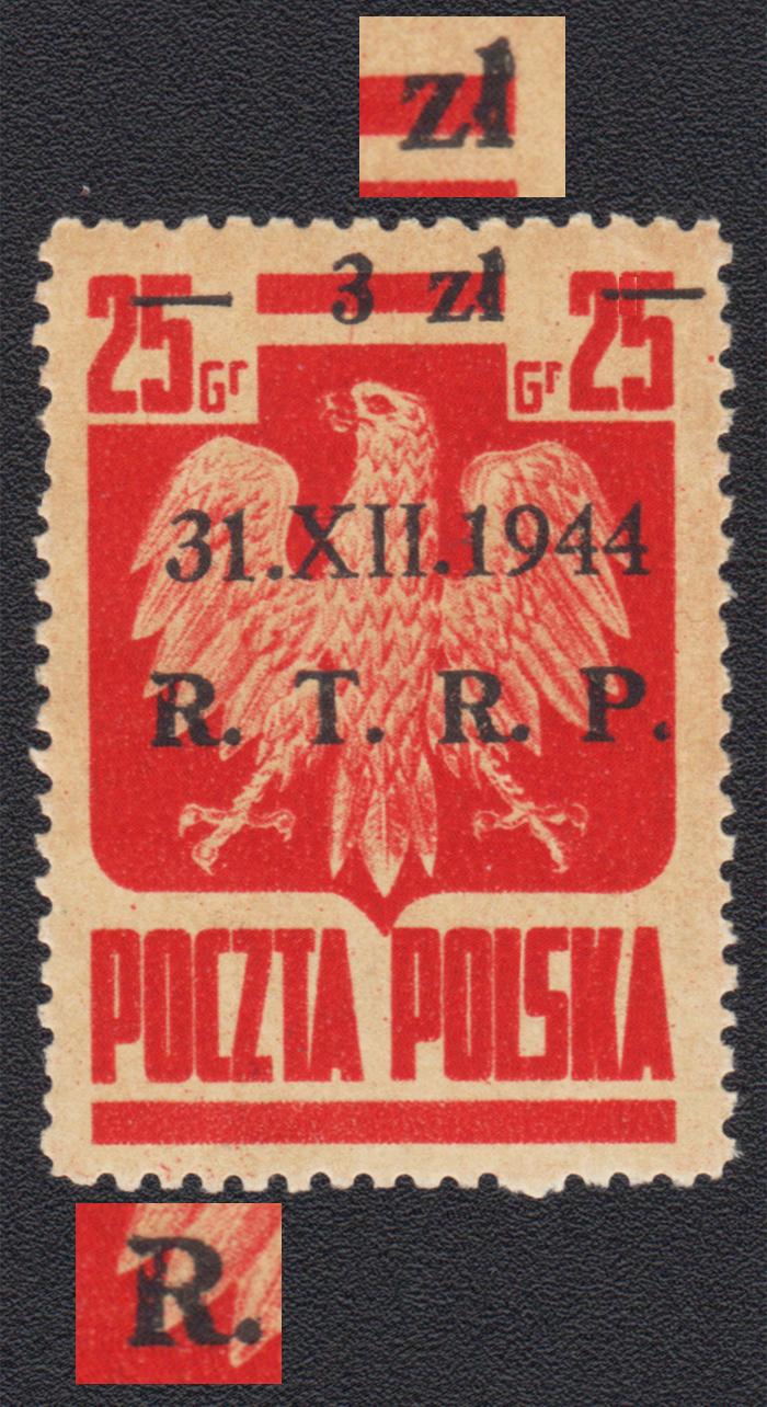 1944 R.T.R.P., znaczek za 3 zł./25 gr. z lekko obróconym nadrukiem i dwoma błędami nadruku na poz.48/98 "uszkodzone ł w zł" oraz "uszkodzona liera R", gwarancja i opis pozycji i błędów Walocha. | Fi.346 B Mi.388 |