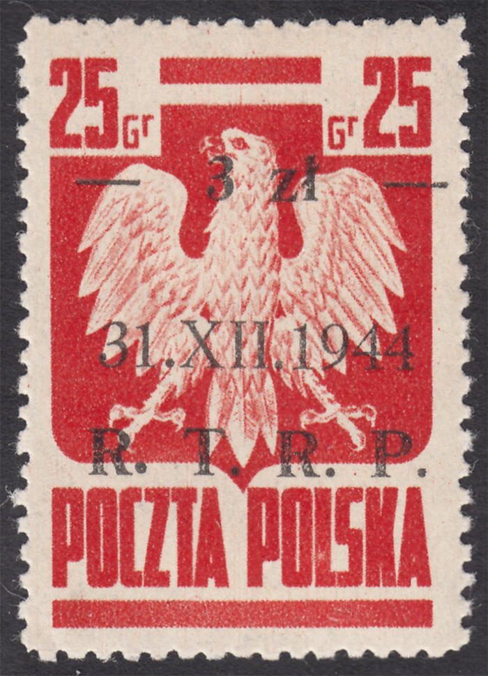 1944 R.T.R.P., znaczek z przesuniętym w górę nadrukiem, cyfra "3" pojawia się już na dole znaczka, gwarancja i opis Więcław. | Fi.346 Mi.388 |