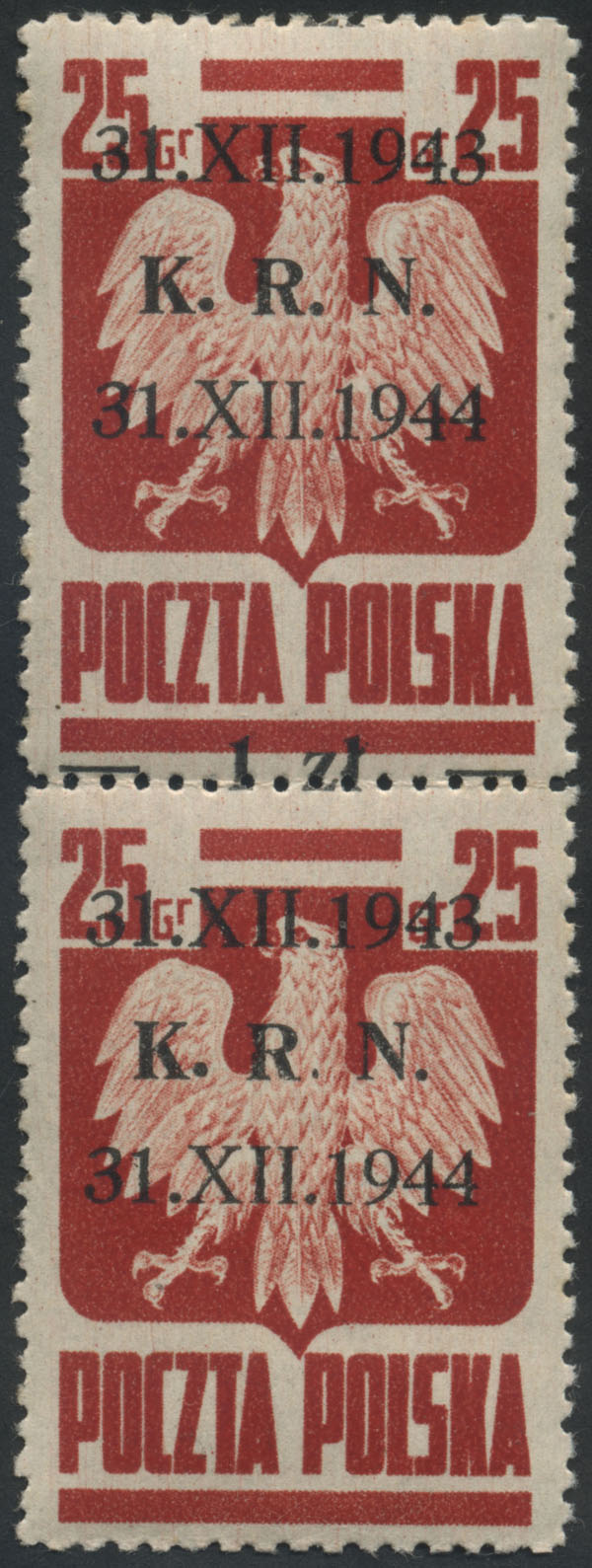1944 K.R.N., parka znaczków z przesuniętym w pionie nadrukiem, dolny znaczek prawie bez nominału. | Fi.344MK Mi.386 |