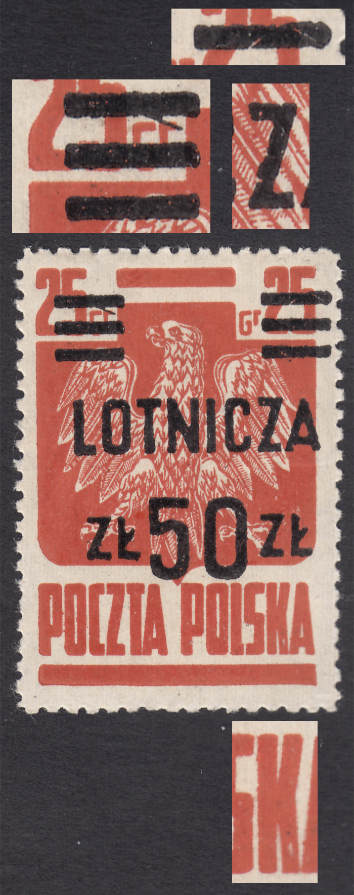 1947 przedrukowe wydanie lotnicze, znaczek za 50 zł./25 gr. w kolorze brązowoczerwonym z katalogowanym błędem na poz.43 "lewa belka z kreseczką", dodatkowo niekatalogowane błędy "potrzaskana prawa belka", "zdeformowana litera Z" i na znaczku podstawowym "biała kreseczka w literze K", gwarancja i opis pozycji Schmutz. | Fi.442b B3 Mi.477b |