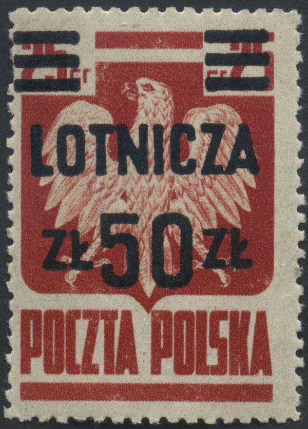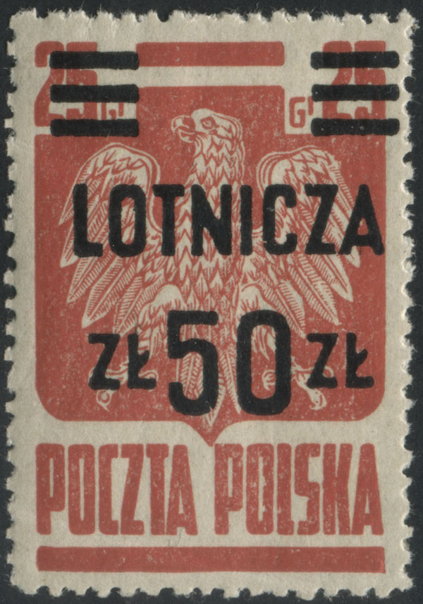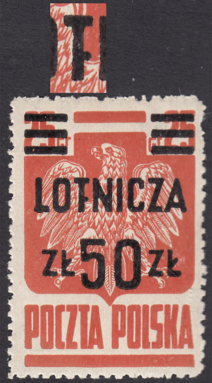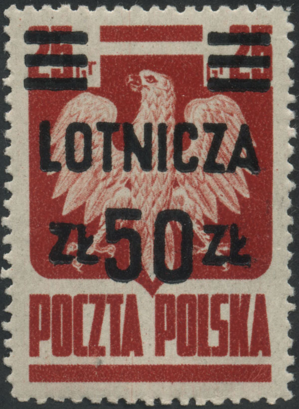 1947 wydanie przedrukowe lotnicze, znaczek za 50 zł./25 gr. w kolorze brązowoczerwonym, z błędem na poz.23 "LOFNICZA", gwarancja Krawczyk. | Fi.442b B1 Mi.477b |