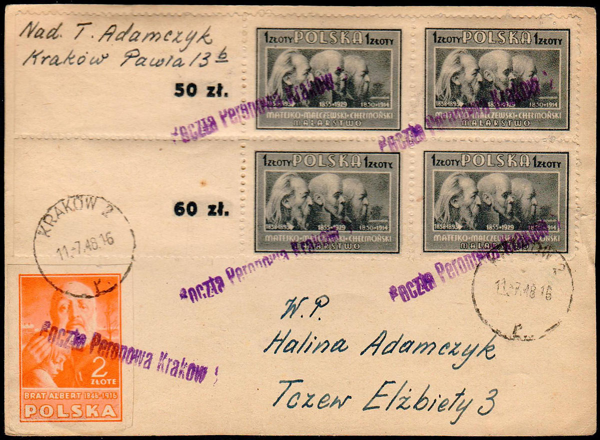 1948 Poczta Peronowa Kraków, kartka do Tczewa, znaczki dodatkowo ze stempelkiem „Poczta Peronowa Kraków” w barwie fioletowej. | Fi.429B, 430A |