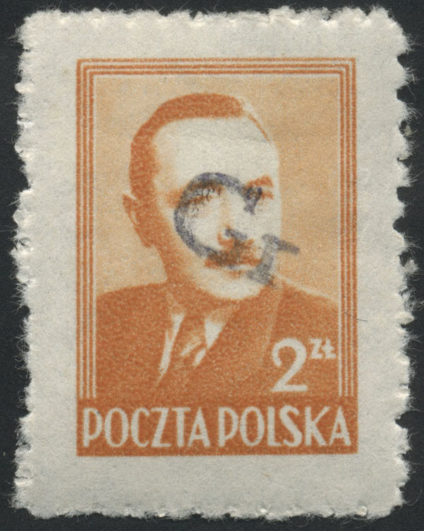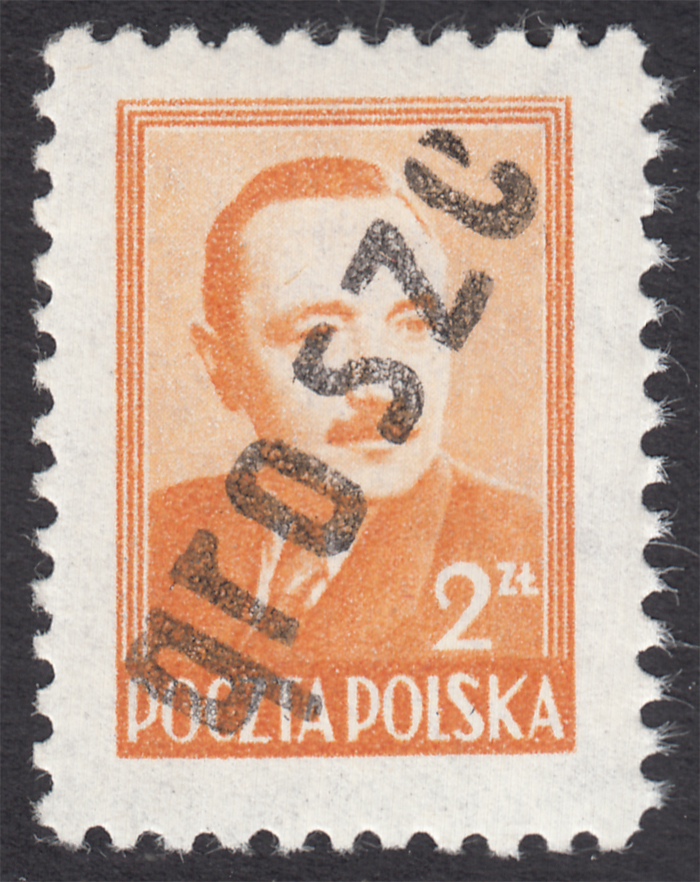 1950 "groszy - lokalny", Bielsk Podlaski, Bierut, nienotowany dotąd znaczek za 2 zł. z czerwonym stempelkiem typu 38, gwarancja Krawczyk. | Fi.470 Mi.621 |