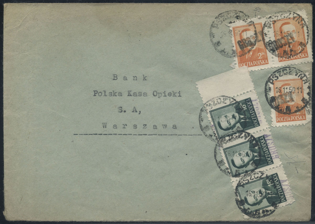1950 groszy, front dużego listu poleconego z Połczyna Zdroju do Warszawy opłaconego znaczkami z nadrukiem groszy typ 21 w barwie czarnej, front listu wielokrotnie złożony. | Fi.449, 513, 527 Mi.590, 659, 665 |